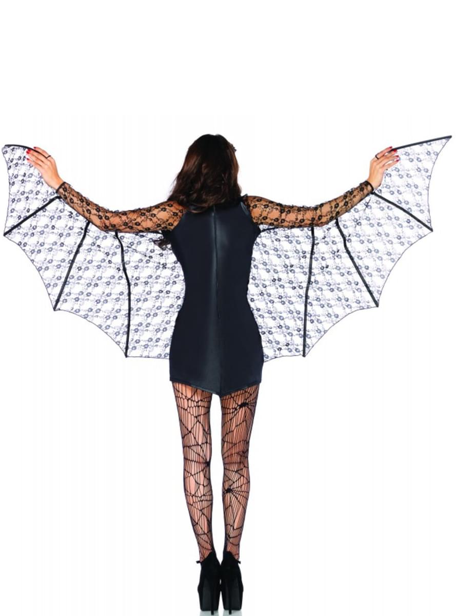 This costume includes a wet look dress with finger looped extendable lace wing sleeves, neck piece, and matching ear headband.