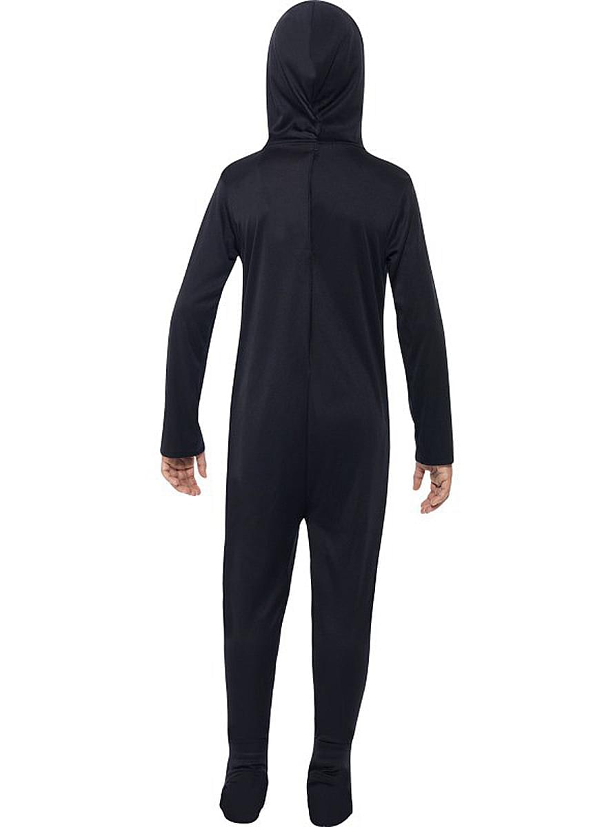 This terrifying skeleton costume includes a black jumpsuit with a hood that also covers the feet and has the bones of the body printed on it in white.