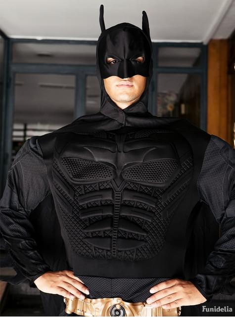 Incluye un mono negro con detalles en 3D de los músculos del pecho y con las características aletas en las mangas y cubrebotas. También se incluye la mascara del murciélago y la gran capa negra. Para completar este magnífico traje del caballero oscuro, se adjunta un cinturón dorado moldeado en 3D con el logo de Batman en el frontal.