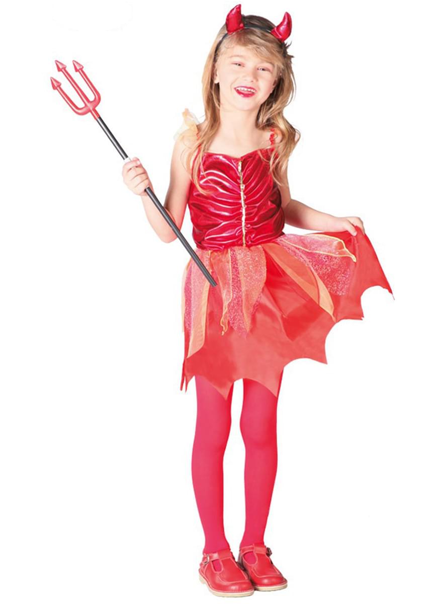 Incluye un vestido rojo con la falda a picos y una diadema roja con cuernos.