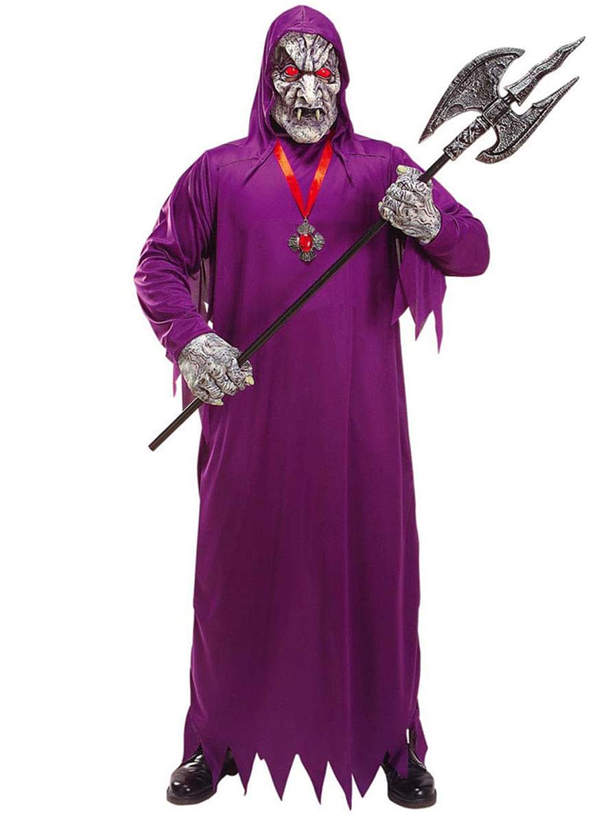 Este terrorífico disfraz de vampiro monstruoso incluye una túnica morada hasta los pies, una máscara con gesto malévolo con capucha y unas manos enormes y tenebrosas.
