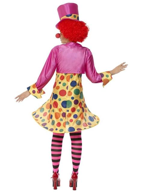 Includes a yellow polka dot dress, pink jacket, bow tie, pink and black striped stockings and a tall hat.
