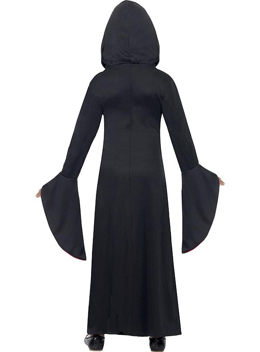 This seductive vampire costume includes a black and red dress to the feet with an imitation corset, wide sleeves and a built-in hood.